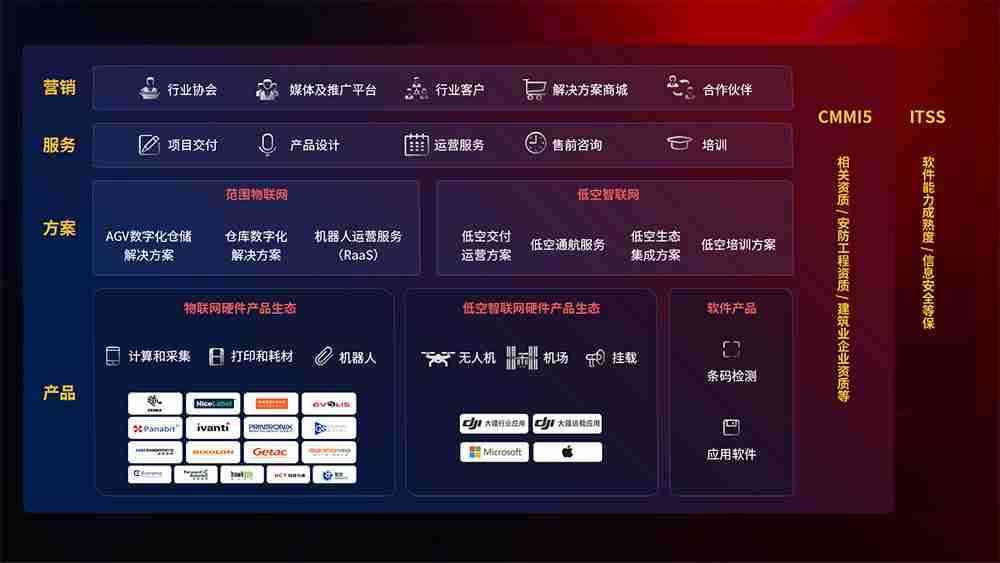 聚合国内外先进的物联网硬件产品品牌,,聚焦数字化仓储、、机器人运营、、低空智联网等领域,,,,共同打造适合客户业务场景的解决方案并提供交付服务